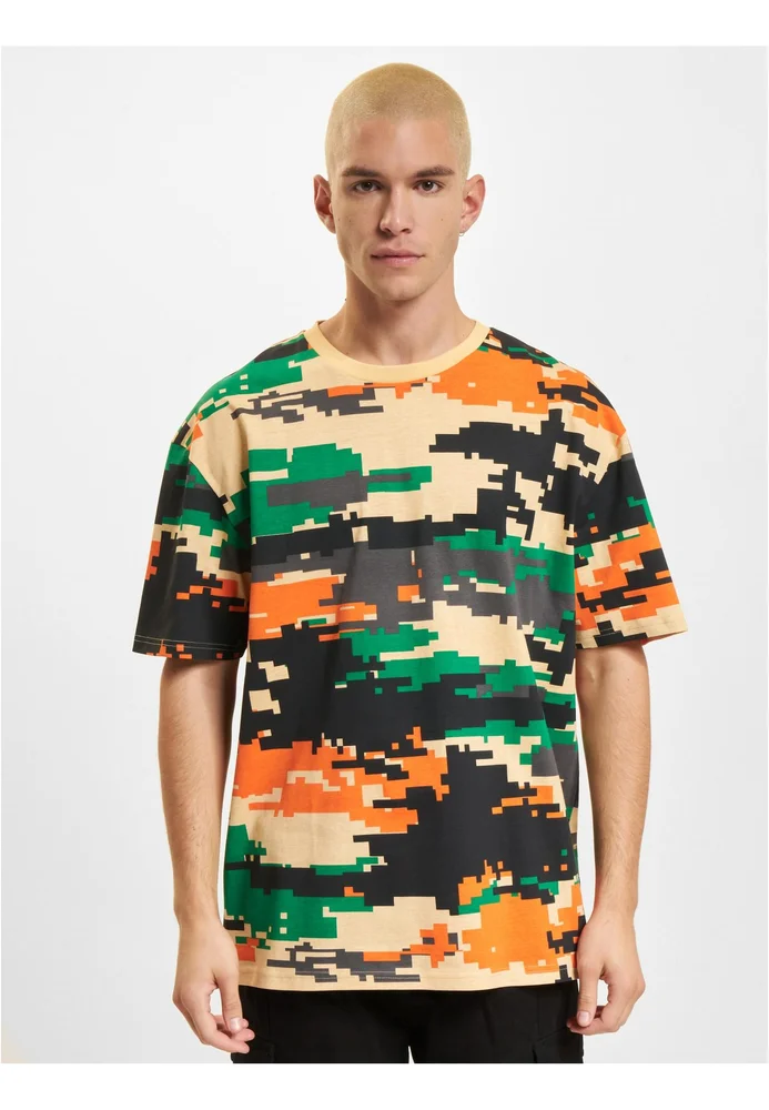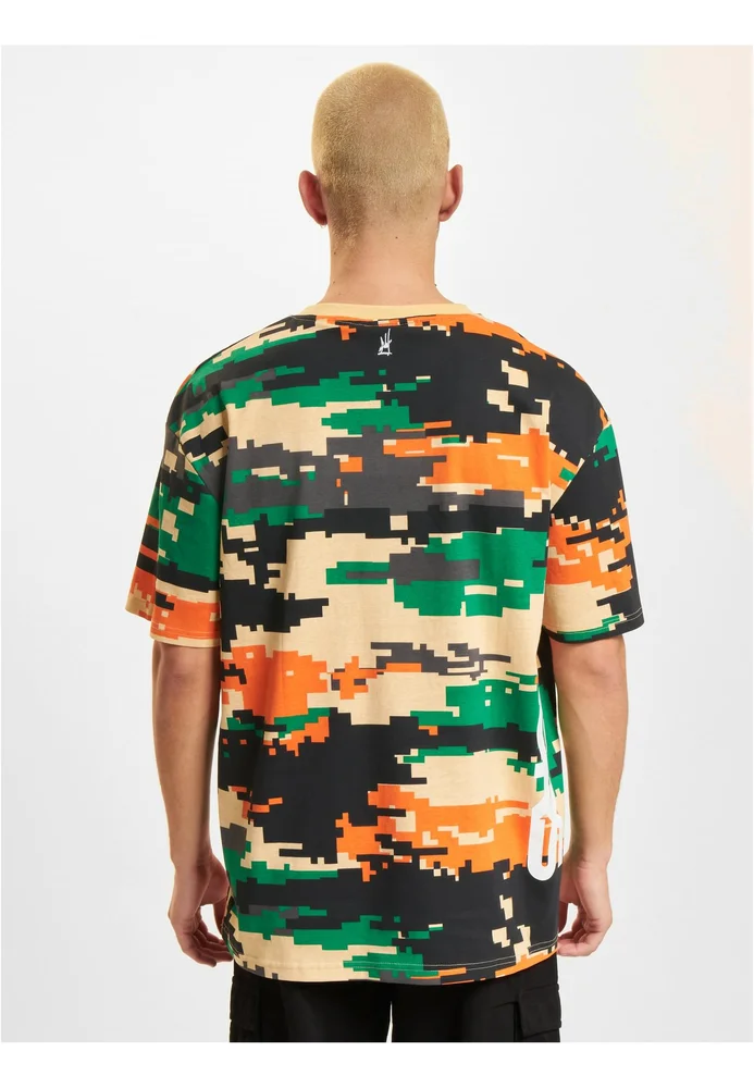 Dieses T-Shirt setzt mit seinem großflächigen Camouflage-Muster in leuchtendem Orange, Grün und Grau ein starkes modisches Statement. Der lockere Schnitt und der klassische Rundhalsausschnitt sorgen für maximalen Tragekomfort, während ein markanter vertikaler Logo-Print an der Seite und eine kleine Stickerei im Nackenbereich den urbanen Streetwear-Look perfekt abrunden.