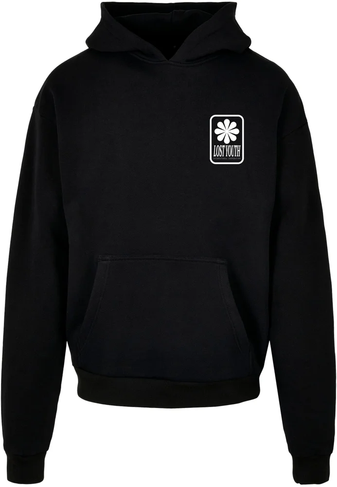 Schwerer Oversized Lost Youth Kapuzenpulli in Schwarz, gewohnter Lost Youth Fit mit hochwertigem Icon Druck, hergestellt aus unserem hochwertigen 460gsm. Baumwollstoff.