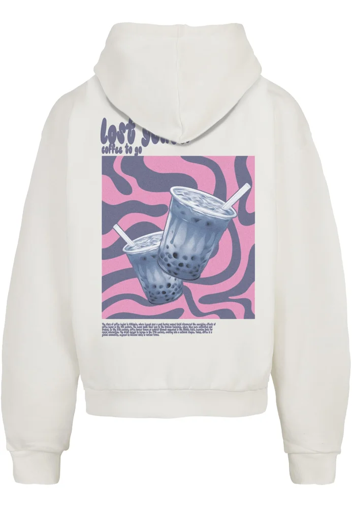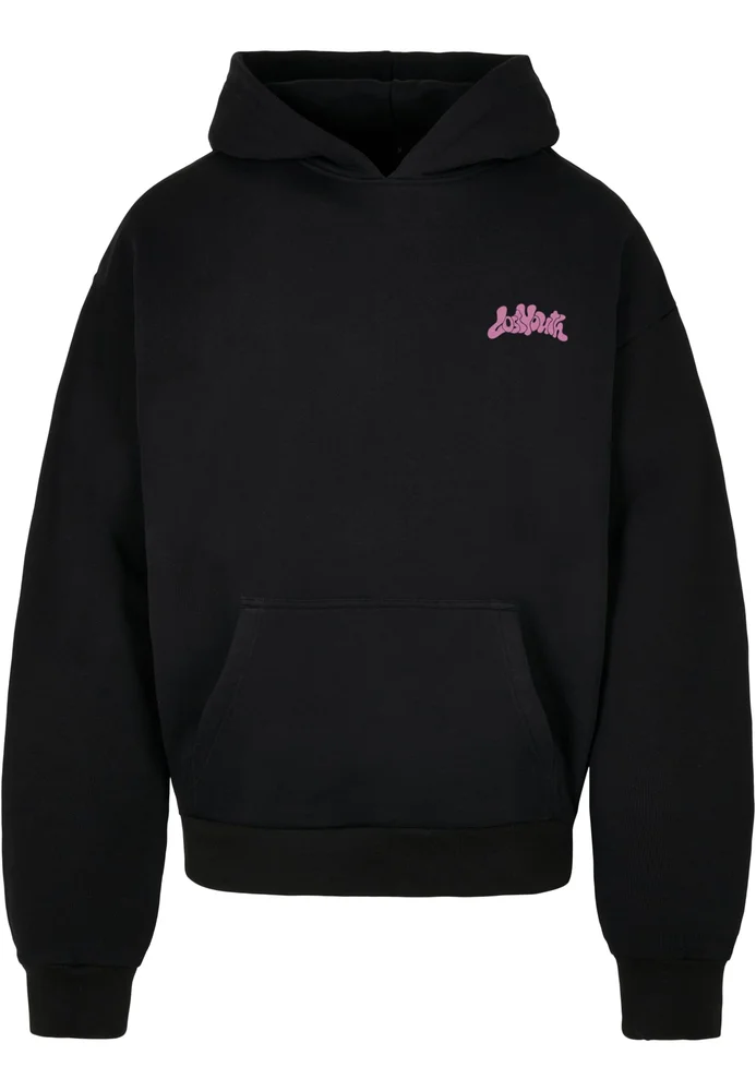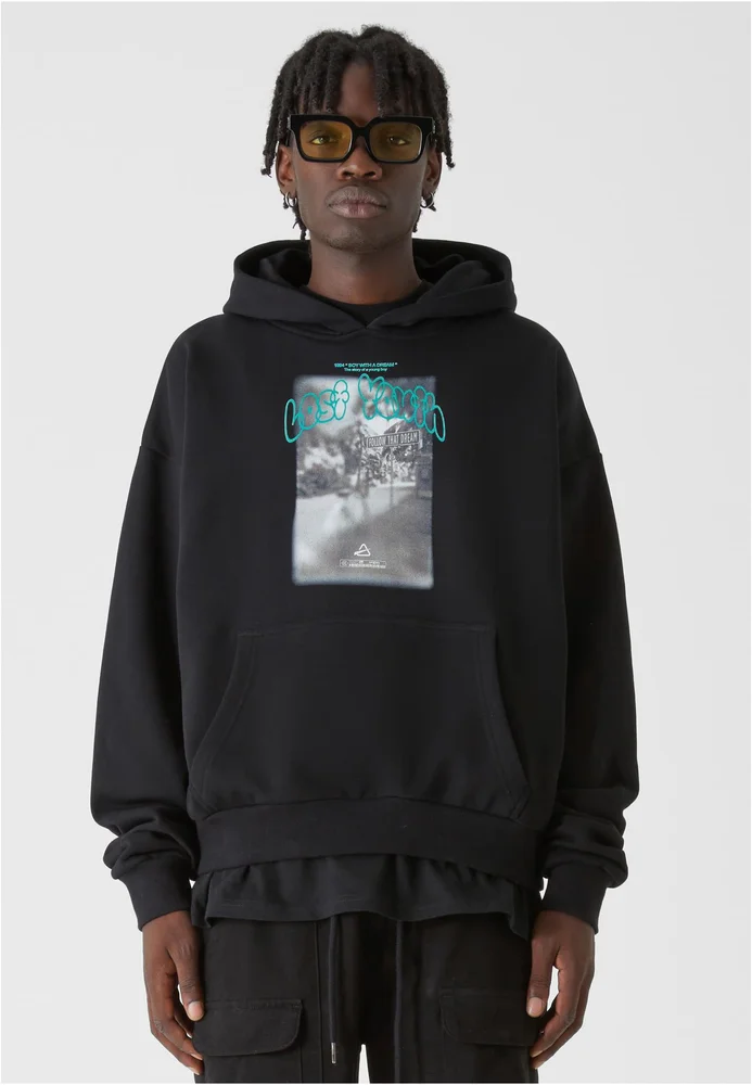 Schwerer Oversized Lost Youth Kapuzenpulli in Schwarz, gewohnter Lost Youth Fit mit hochwertigem Collab Druck, hergestellt aus unserem hochwertigen 460gsm. Baumwollstoff.