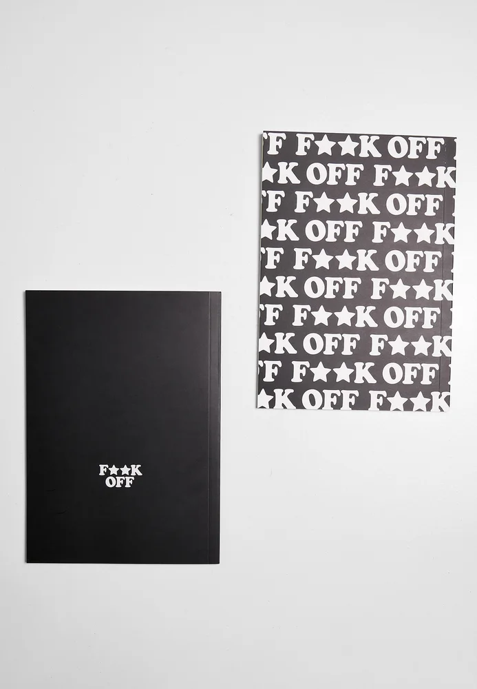 Das Doppelpack kombiniert zwei Blanko Arbeitshefte im DIN A5-Format im Fuck Off-Motiv: Ein Deckblatt zeigt den Schriftzug, der entlang der Längskante verläuft, das zweite einen Alloverprint. Auf der Rückseite wiederholt sich der Schriftzug zentral.