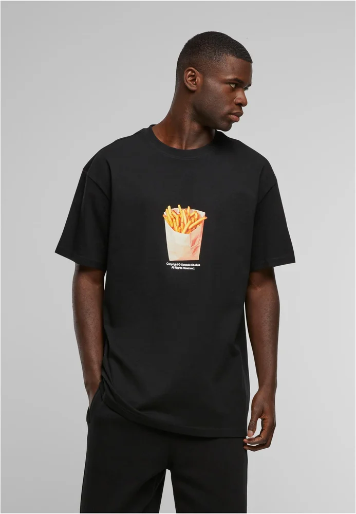 T-Shirt aus der Kategorie Tees, designed als heavy oversize piece für einen relaxed fit und longline-Schnitt, ideal als everyday layer. Gefertigt aus dichtem Baumwolljersey mit robuster Haptik, bietet es angenehme Struktur und Formstabilität ohne transparent zu wirken. Der runde Halsausschnitt trifft auf kurze, eingesetzte Ärmel und einen geraden Saum, wodurch die lässige Silhouette klar bleibt, während ein zentraler Print mit Pommes-Motiv dem Shirt einen markanten Blickfang verleiht. Trägt sich unkompliziert und lässt sich leicht mit Jeans oder relaxed Hosen kombinieren, Pflegehinweise richten sich nach typischen Baumwollstandards.