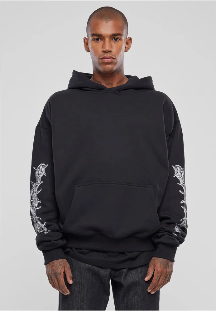 Hoodie, ideal als everyday layer, präsentiert sich im oversize fit mit markanter Kapuze und klassischem Rundhalsausschnitt, wodurch er lässige Silhouetten unterstützt. Aus weichem Baumwolljersey gearbeitet, wirkt das Modell robust und angenehm im Griff, während aufgesetzte Kängurutasche und eingesetzte Ärmel klare Funktionalität bieten. Die langen Ärmel zeigen auffällige Print-Details entlang der Außennaht, die dem Stück Ausdruck verleihen, und Rippbündchen an Saum und Abschlüssen sorgen für Formstabilität. Der Regular-Length-Schnitt lässt sich unkompliziert über anderen Lagen tragen und eignet sich als entspannte Alltagsschicht für vielseitige Kombinationen.