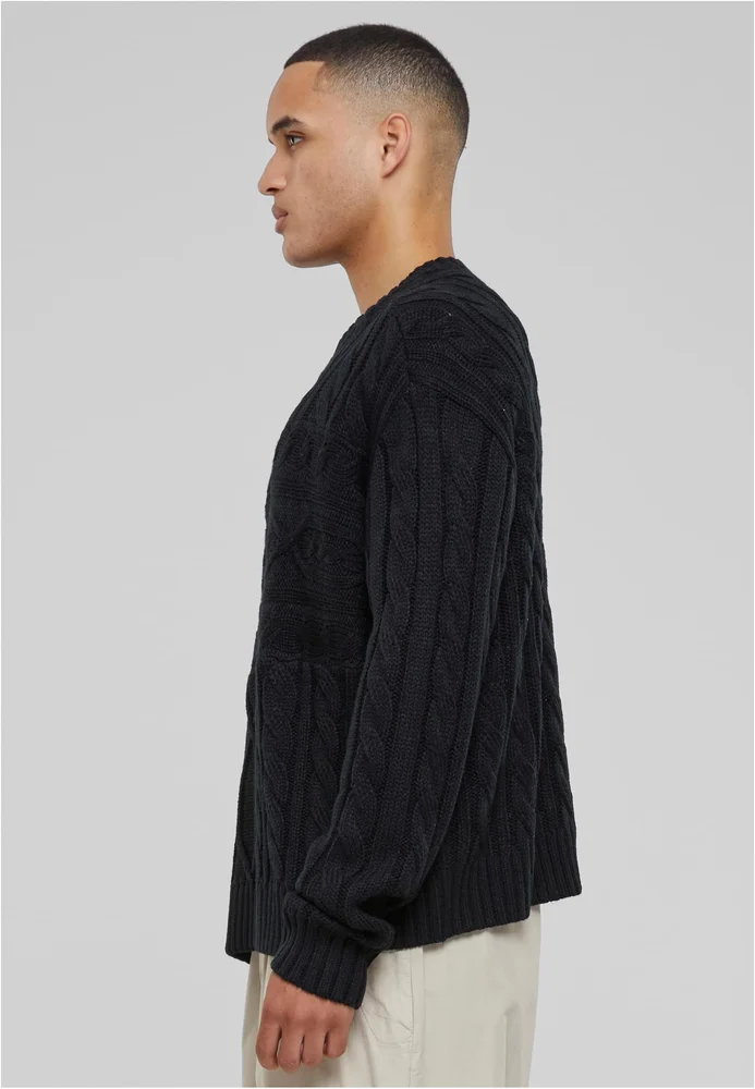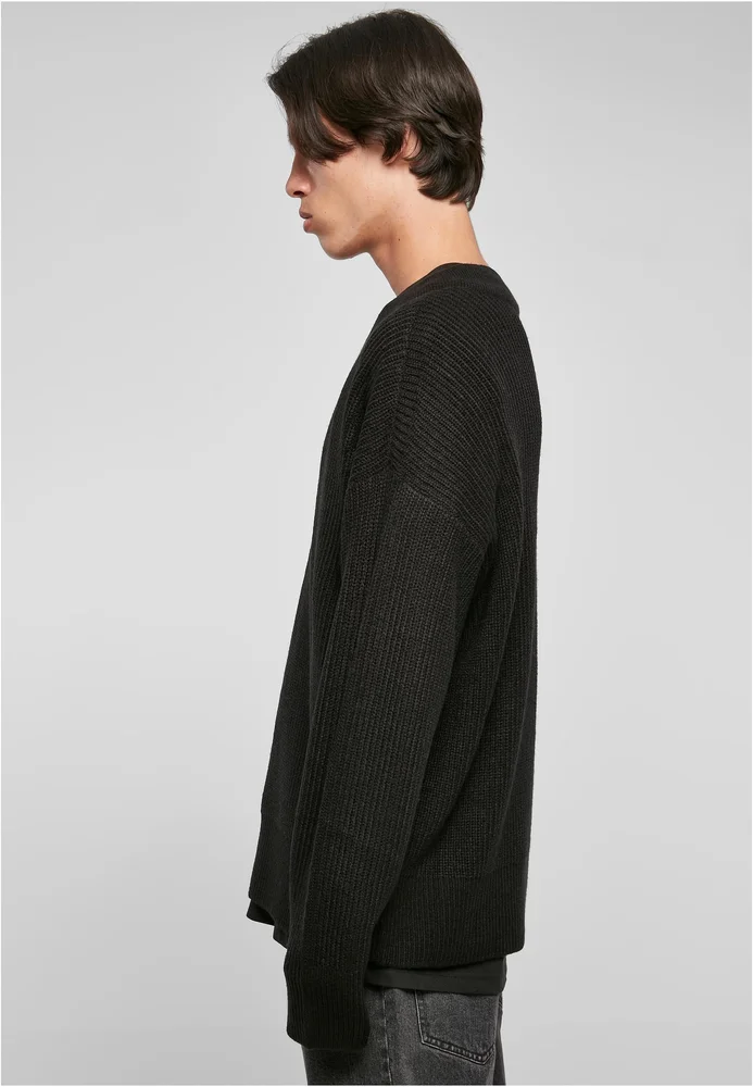 Der Herren Strick-Pullover setzt mit seinem tiefen und breit gerippten V-Ausschnitt ein urbanes Statement. Seine Loose Fit Passform mit stark überschnittenen Schultern und der breite Rippenstrick ergänzen den Look perfekt. Er wird von breiten Abschlüssen an Ärmeln und Saum komplettiert. Der Männer Strick-Sweater besteht aus Acryl und Polyamid.