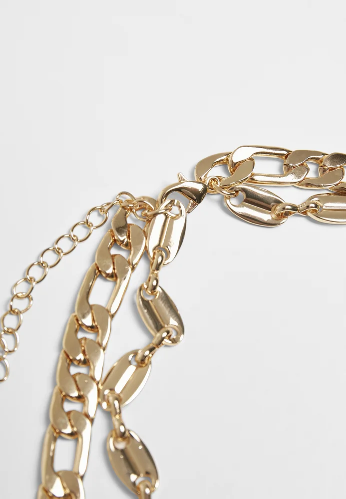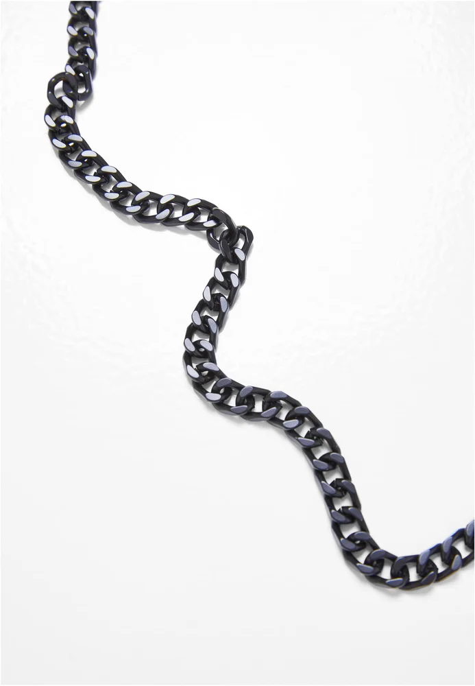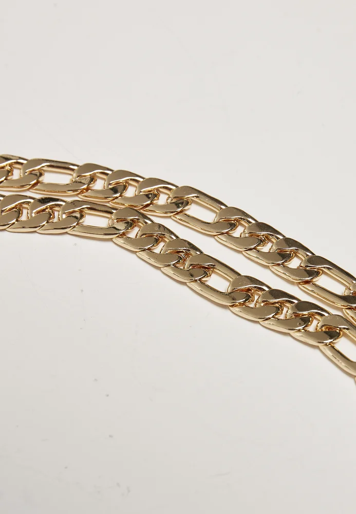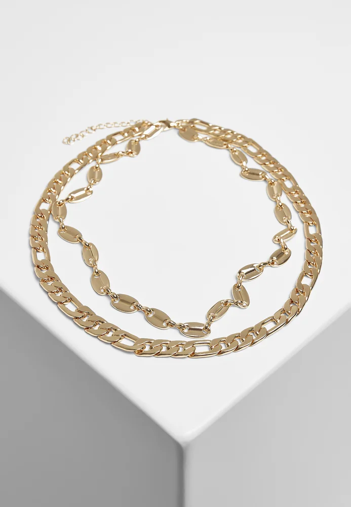 Die doppelreihige Kette im Layering-Style ist ein angesagtes Schmuck Accessoire, das jedes urbane Outfit authentisch komplettiert. Die innere Kette hat Ankerglieder, die äußere ist eine Figaro-Kette, bei der je drei kleinere Glieder von einem größeren unterbrochen werden. Die Urban Classics Kette besteht aus Eisen.