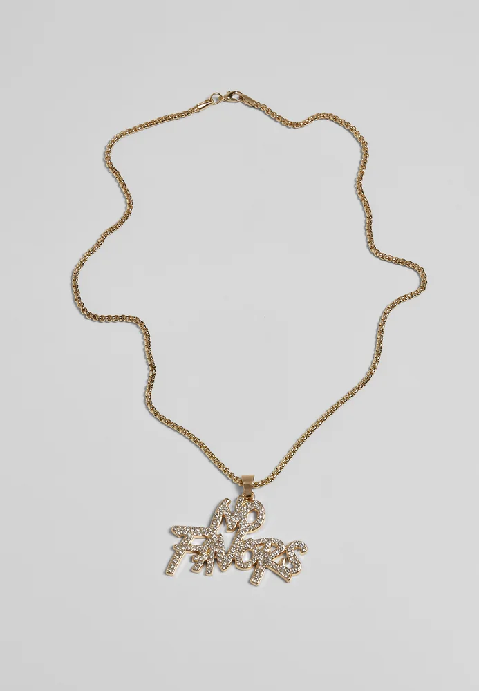 Das Modeschmuckstück legt seinen Fokus voll auf einen satten No Favors-Anhänger ein Schriftzug in Großbuchstaben, der von feinen Steinchen besetzt ist. Der Anhänger baumelt an einer 60 Zentimeter langen Kette im kompakten Design einer Erbskette. Das Urban Classics Schmuckstück besteht aus einer Zinklegierung und Eisen.
