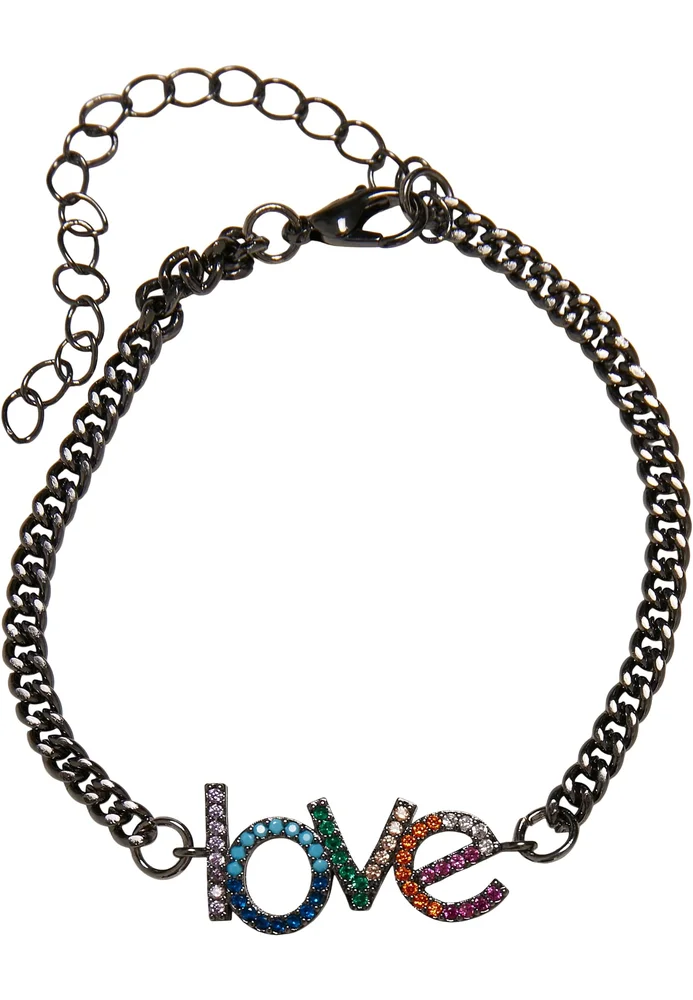 Mit seinem bunten Love-Anhänger aus feinen Steinchen hat dieses Armband eine klare Botschaft zu verkünden. Der Schriftzug ist in eine feine, dunkle Kette mit Flachpanzergliedern integriert und macht ordentlich was her. Das Urban Classics Armband besteht aus Messing und Eisen und kommt in zwei Größen.
