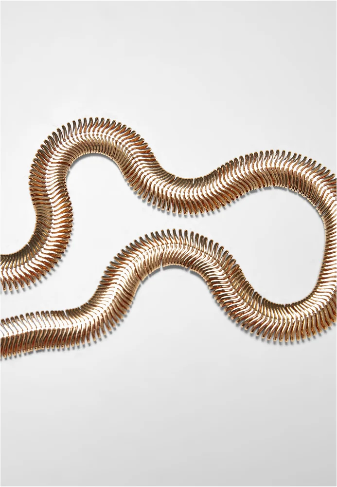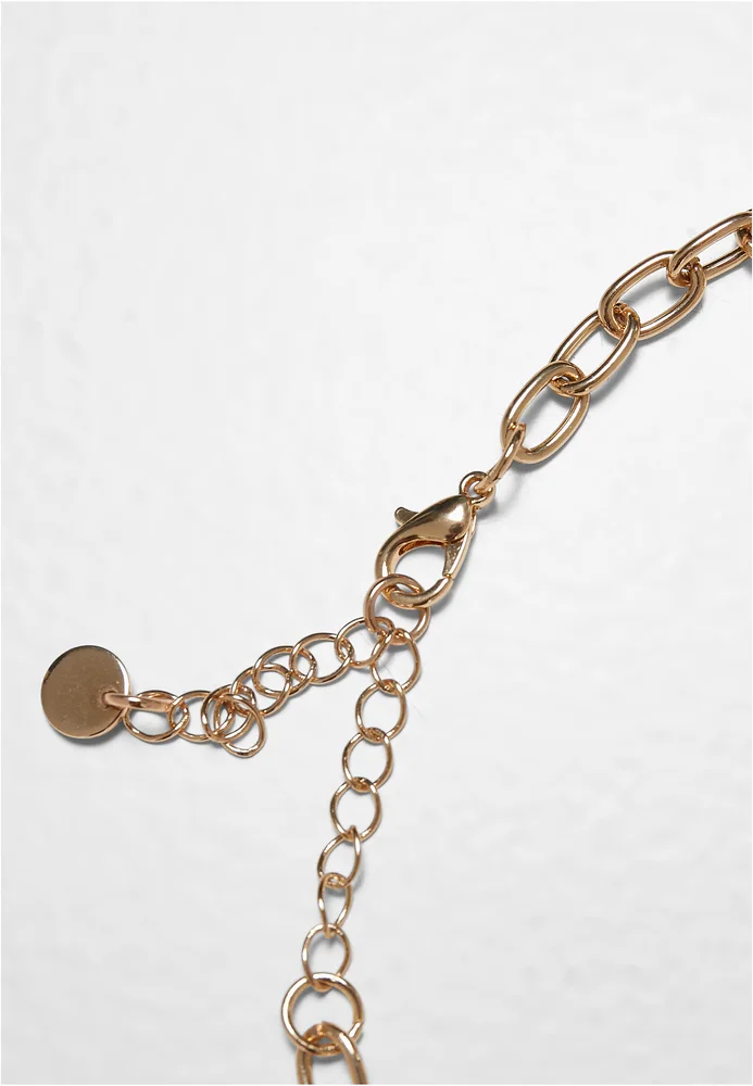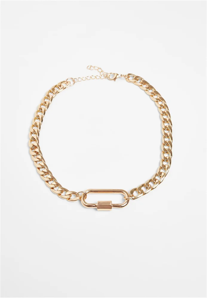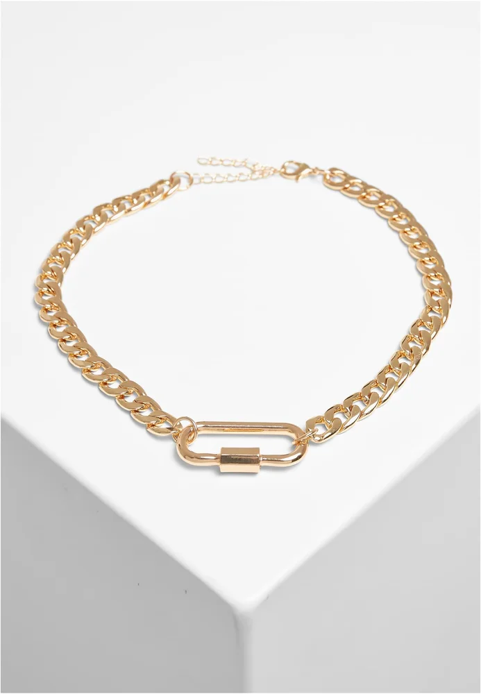 Halskette, vielseitig als dezentes Alltagslayer oder markantes Statement-Element einsetzbar, bietet verstellbare Länge durch ein Verlängerungskettchen für verschiedene Tragevarianten. Die Verarbeitung aus metallischer Legierung vermittelt eine kühle, strukturierte Haptik und eine spürbare Substanz ohne technische Details zu nennen. Konstruktion und Form betonen robuste Kettenglieder sowie ein auffälliges, ovales Verbindungselement vorn, das zugleich als gestalterischer Mittelpunkt fungiert, während ein Haken-und-Ösen-Verschluss sicheren Sitz ermöglicht. Das Stück fügt sich zu lässigen wie zu anspruchsvolleren Looks und trägt durch klar definierte Linien und gewichte Elemente zur Outfitgestaltung bei.