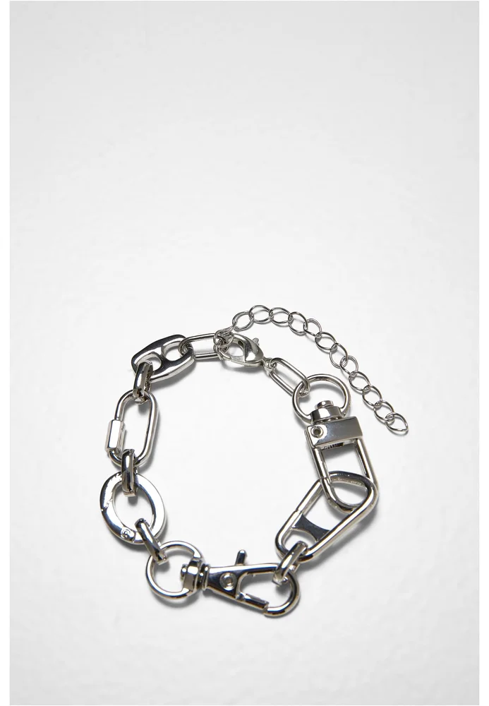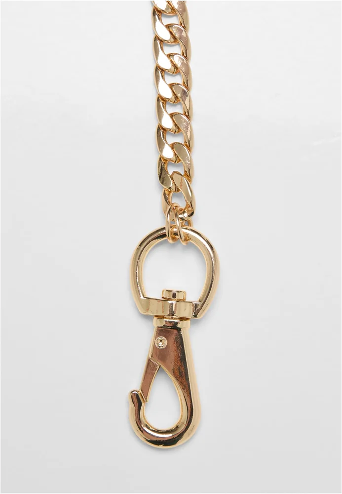 Diese urbane Schlüssel-Kette besitzt auf einer Seite einen Ring, um Schlüssel zu befestigen und auf der anderen Seite einen robusten Karabiner, der zum Beispiel an einer Gürtelschlaufe oder Tasche festgeklippt werden kann. Die gold- oder silberfarbene Kette aus Eisen hat die Form von abgeflachten Panzergliedern.