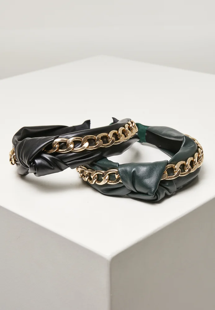 Einen überaus hippen Look bietet dieses Doppelpack an Haarreifen in abgestimmten Farben. Sie bestehen aus Kunstleder (Polyester), das mittig raffiniert zu einem Knoten geschlungen ist. Highlight der Accessoires ist die integrierte, umlaufende Panzerkette mit großen Kettengliedern, die aus Eisen besteht.