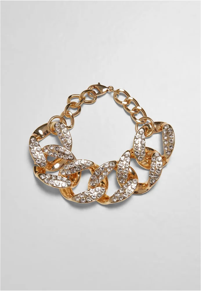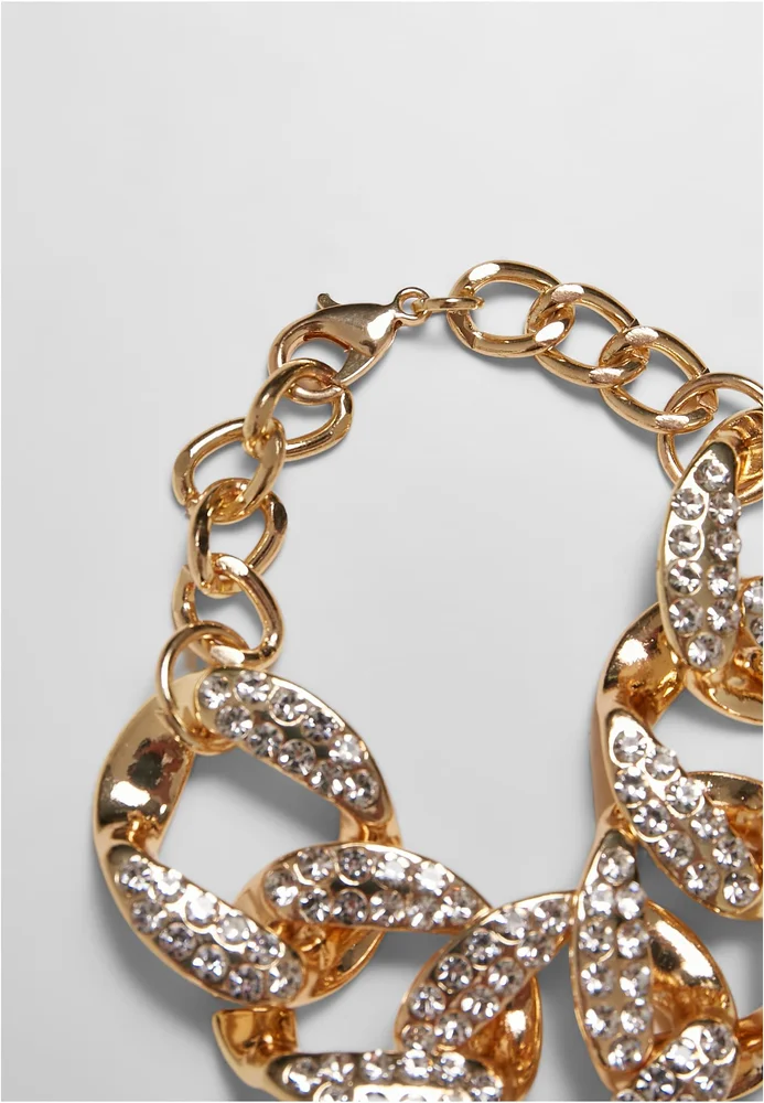 Das Modeschmuck Armband setzt voll auf sechs großen Panzerkettenglieder, die sich ineinander schmiegen und mit einer Doppelreihe Strass-Steinchen besetzt sind. Das Armband ist 21 Zentimeter lang und besteht aus einer Zinklegierung und Eisen.