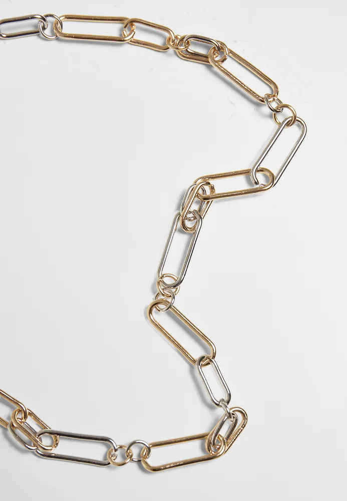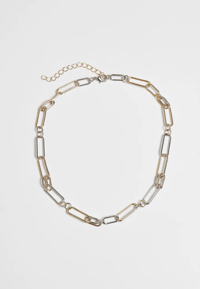 Halskette als feiner Alltagsbegleiter, gestaltet für dezentes Layering und unkomplizierte Kombinationen. Das Schmuckstück besteht aus Metall und zeigt eine schlichte Kettenstruktur aus länglichen, rechteckigen Gliedern, die in gleichmäßigem Rhythmus aneinandergereiht sind, ergänzt durch eine einstellbare Verlängerungskette am Verschlussende. Zur Handhabung dient ein Haken?und?Ösen?Verschluss, der von rechts nach links schließt und sicheren Halt bietet. Das reduzierte Design betont klare Linien und wirkt sowohl zu legeren als auch zu formelleren Outfits zurückhaltend elegant, wobei die leichte, flache Konstruktion angenehm am Hals liegt und sich gut als einzelnes Accessoire oder im Layering einsetzen lässt.