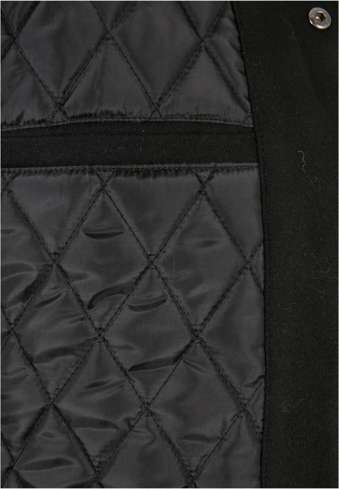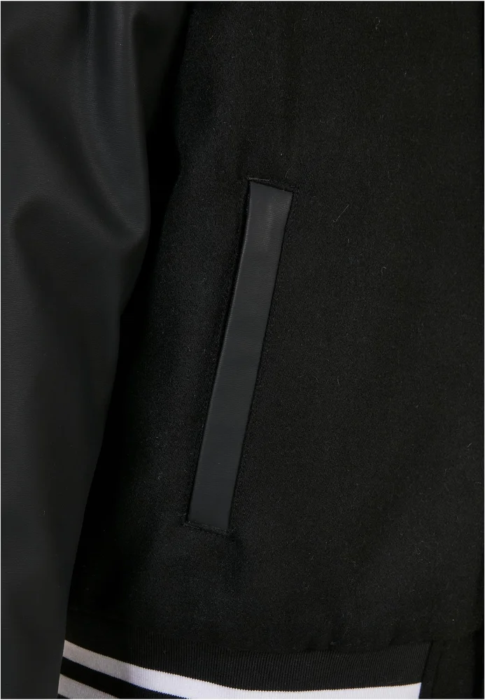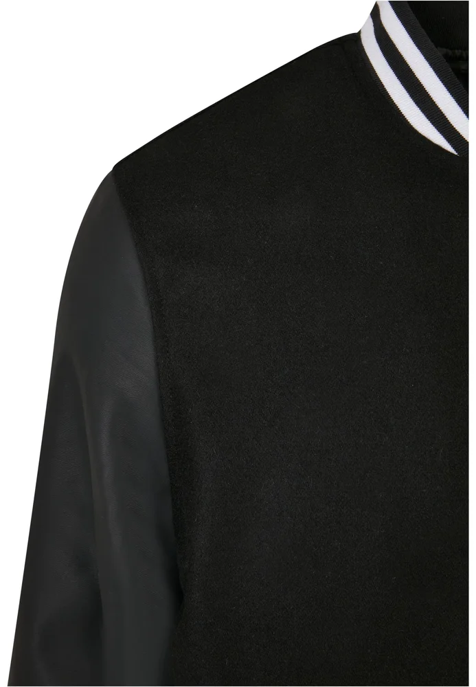 Im bewährt-sportlichem Style zeigt sich diese Herren College Jacke mit Ärmel aus einem anderen Material und Kontrastfarbe. Sie kommen als Lederimitat, während der Rumpf aus einer Wollmischung besteht. Ein großes, aufgestepptes U setzt auf der Brust einen weiteren Akzent. Im Inneren ist die Männer College Jacke wiederum mit weichem Taft gefüttert. College-Style verleihen die typisch längsgestreiften, breiten Rippenbündchen an Ärmeln und Saum sowie der niedrige Kragen im gleichen Stil. Die sportive Männerjacke wird mittels einer Druckknopfleiste geschlossen. Sie ist mit zwei Seitentaschen und einer Innentasche ausgestattet. Souverän ist die legere Oversize Fit Passform.