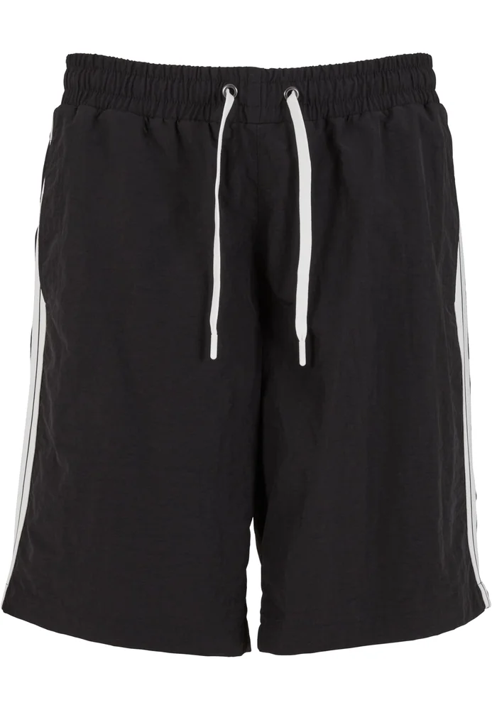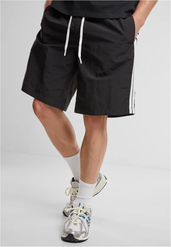 Die Board Shorts With Patched Stripe sind eine lässige und sportliche Wahl für den Sommer. Der Schnitt ist bequem und knielang, was für eine entspannte Silhouette sorgt. Charakteristisch ist das Material, das eine leichte, crinkleartige Struktur aufweist. Ein aufgesetzter Streifen-Akzent verleiht den Shorts eine dynamische Optik und unterstreicht den athletischen Stil. Sie sind das ideale Essential für alle Aktivitäten am und im Wasser.