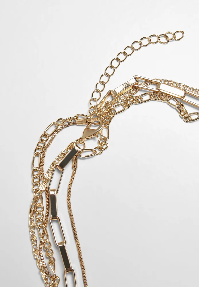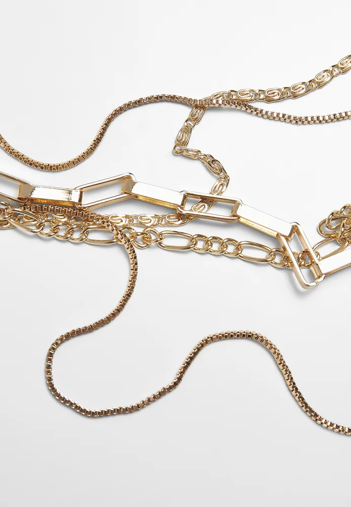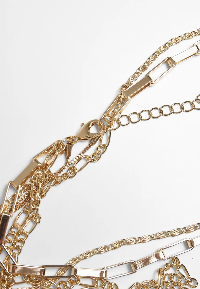 Die vierreihige Modeschmuck-Kette vereint ganze vier unterschiedliche Designs und mündet in einer filigranen äußeren Kette mit einem Amulett in Münzform. Die inneren Reihen besitzen eine Ankerketten- bzw. Figarokettenform. Das Urban Classics Schmuckstück besteht aus Eisen und einer Zinklegierung. Es kommt als Einheitsgröße.