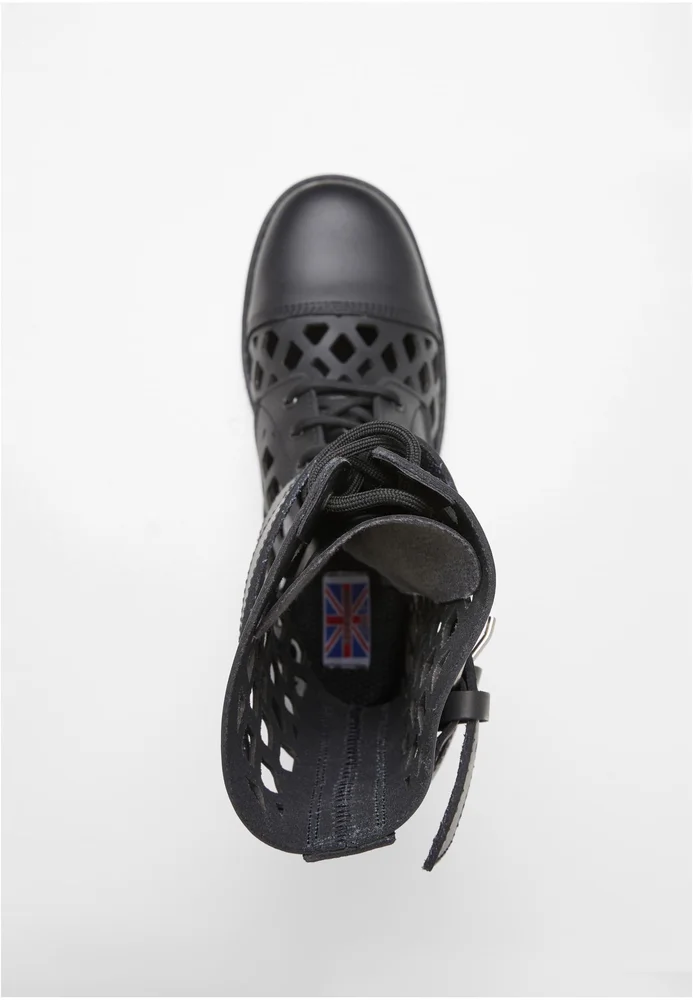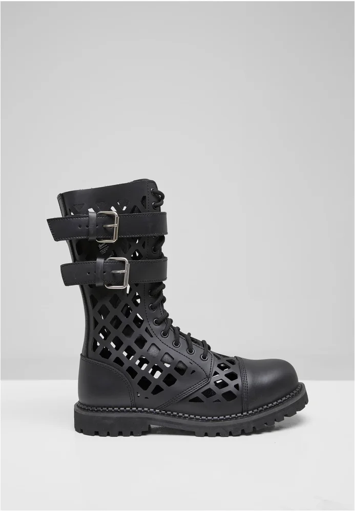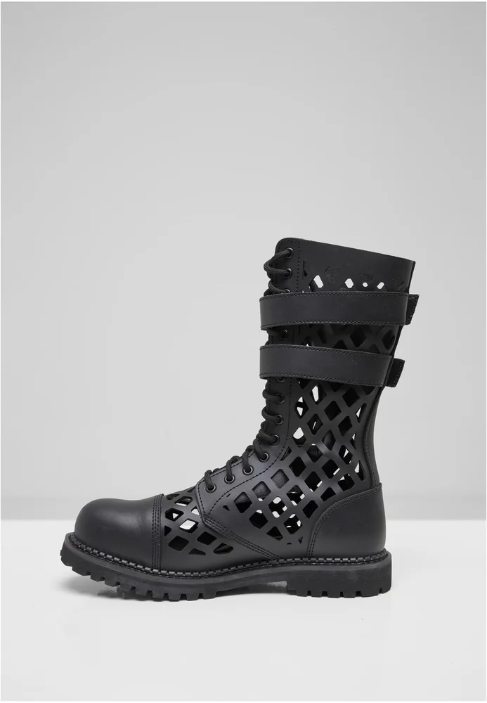Outdoor-Stiefel mit markanter Gitteroptik und klarem Einsatz für rauere Einsätze: Die hohe Schaftkonstruktion trägt Laces als Verschluss und zusätzliche zwei verstellbare Schnallenriegel, die Fuß und Knöchel stabilisieren, während die sichtbare Zehenkappe und die profilierte, robuste Gummisohle Trittsicherheit vermitteln. Die Kombination aus gegerbtem Leder im Schaftbereich und einer griffigen Gummiplattform sorgt für substanzielle Haptik und Schutz, der sich im Alltag ebenso bewährt wie bei Ausflügen. Der Schnitt ist bewusst funktional mit verstärkter Zehenpartie und hohem Schaft, die Verarbeitung betont Strapazierfähigkeit; Reinigung erfolgt pflegeleicht nach Bedarf.
