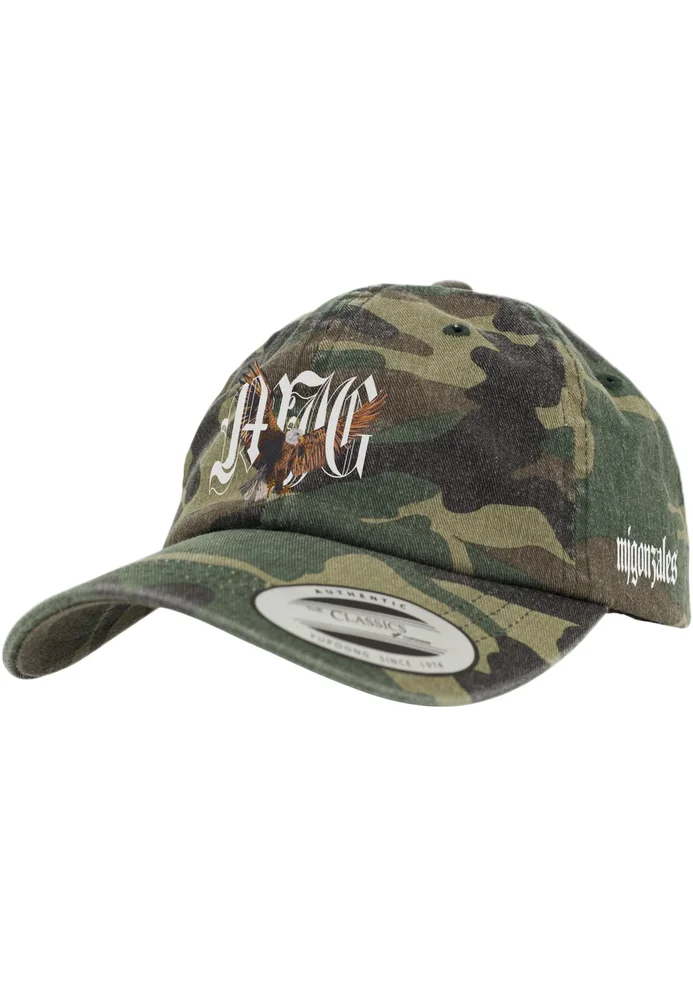 Diese Cap von MJGONZALES im klassischen Camouflage-Design vereint authentischen Military-Look mit urbanem Flair. Die Vorderseite ist mit einem auffälligen Print versehen, der einen majestätischen Adler im Flug vor großen, weißen Initialen zeigt. Ein dezenter mjgonzales-Schriftzug im Gothic-Stil an der Seite rundet das Design ab. Dank des verstellbaren Verschlusses und der robusten Materialqualität ist diese Cap das perfekte Accessoire für markante Street-Styles.
