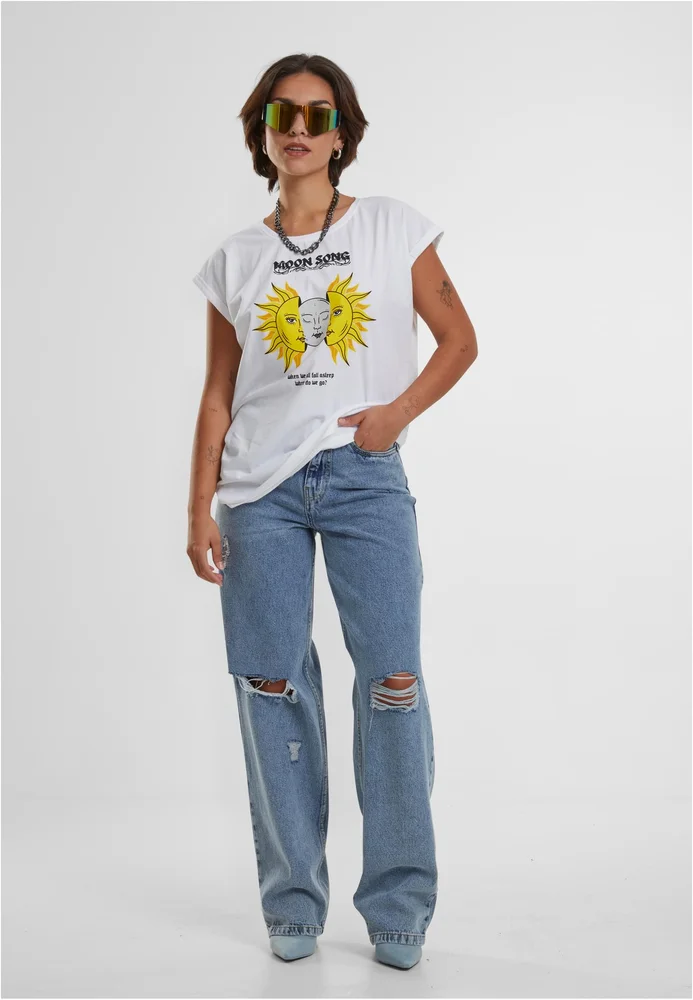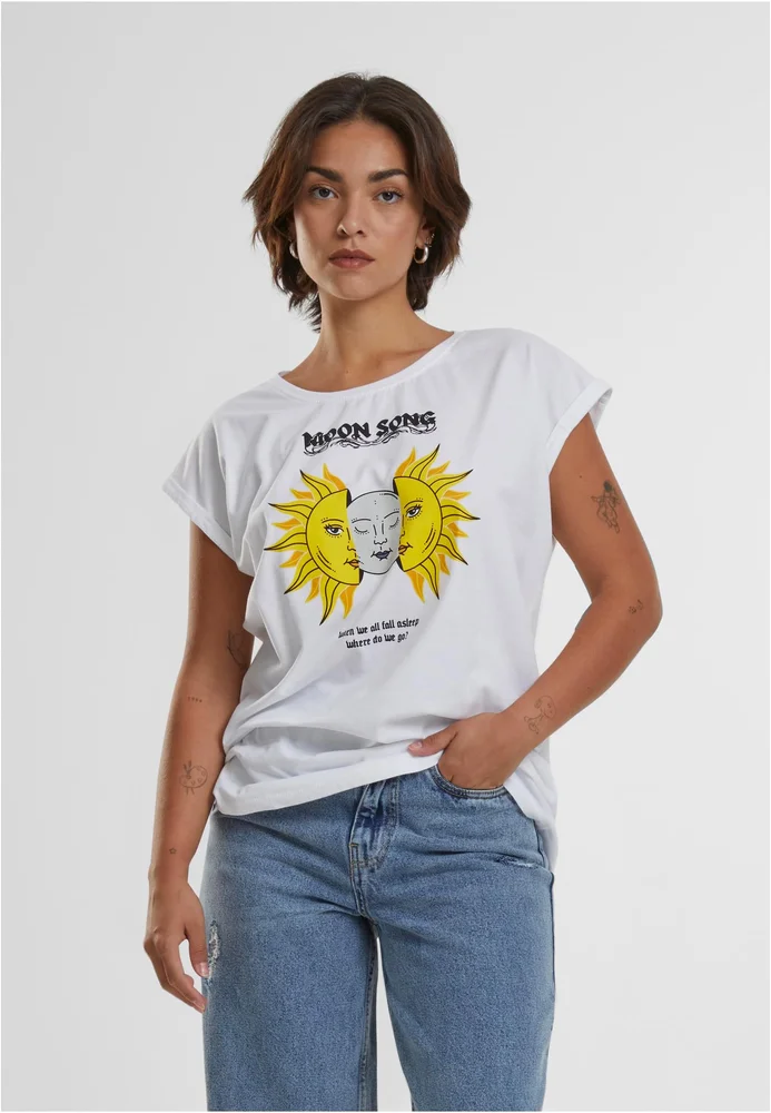 Das T-Shirt „Moon Song“ bedruckt mit dem Frontmotiv einer sich teilenden Sonne und eines schlafenden Monds beschäftigt sich mit der philosophischen Frage „When we fall asleep where do we go?“. Kennt ihr die Antwort? Äuglein zu, der Sandmann kommt. Willkommen im Land der Träume.