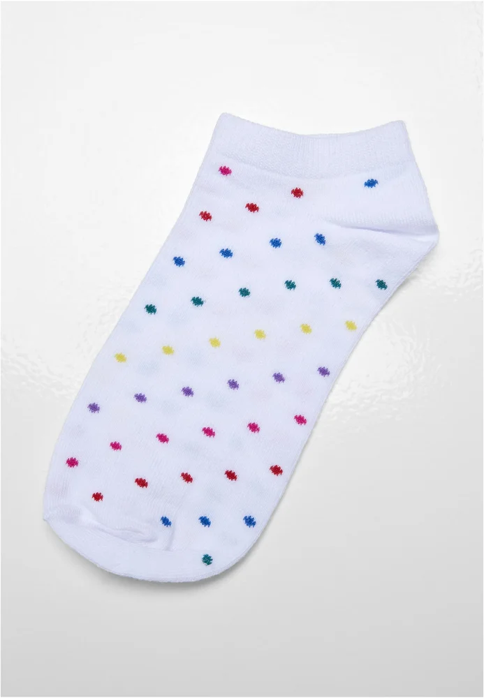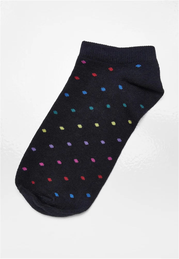 Das Set beinhaltet fünf Paar Füßlinge in unterschiedlichen Farbdesigns. Jedes Paar ist mit Regenbogenpunkten regelmäßig getupft. Bewährten Tragekomfort bringen das geschmeidige Material aus Baumwolle, Polyester und Elasthan sowie die schmalen, elastischen Bündchen. Die No-Show-Socks sind in vier Größen erhältlich.