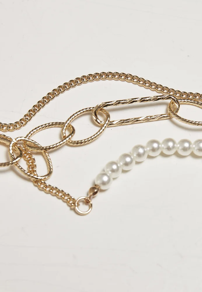 Mit fettem Style wertet diese dreireihige Schmuck-Kette jedes Urban Outfit auf. Die feine äußere Reihe trägt ein rundes Amulett mit einem Porträt im Profil. Die mittlere Reihe überzeugt mit ihren großen runden wie länglichen Gliedern. Die innere Reihe des Schmuckstücks besteht aus Perlen und einem Amulett in Wellenform. Das Urban Classics Accessoire besteht aus Eisen, einer Zink-Legierung sowie ABS.