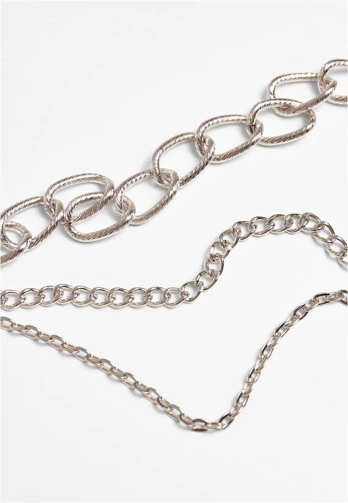 Der Modeschmuck punktet mit einem Layer-Style aus drei Reihen mit unterschiedlicher Gliederform und Größen, die an die Optik von Panzer- und Ankerketten angelehnt sind. Das Accessoire sitzt mittelhoch am Hals, die mittlere Kette ziert ein halbmondförmiger Anhänger. Die Halskette ist 48 cm lang und kommt mit einer 7 cm langen Verlängerungskette. Sie besteht aus Eisen und einer Zink-Legierung.