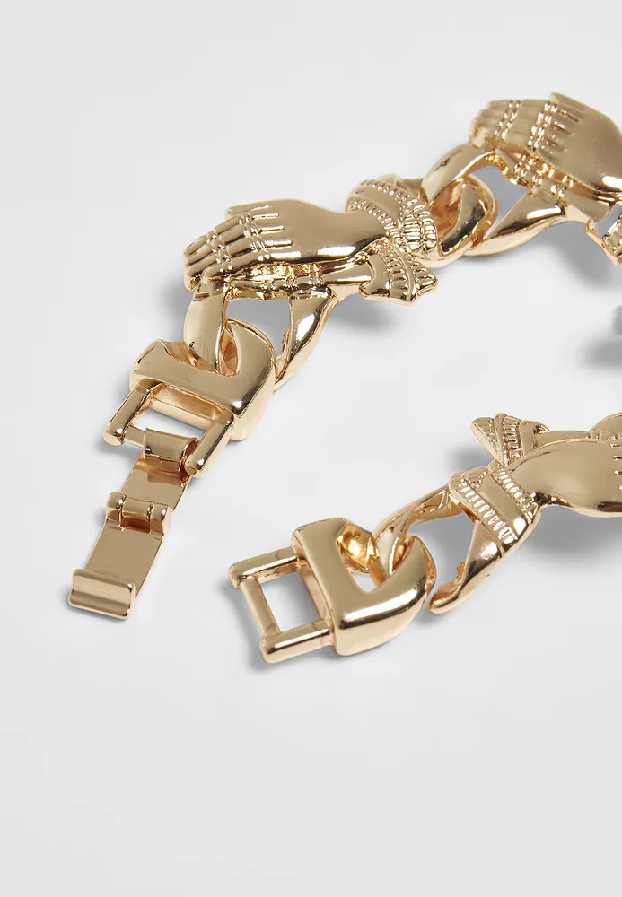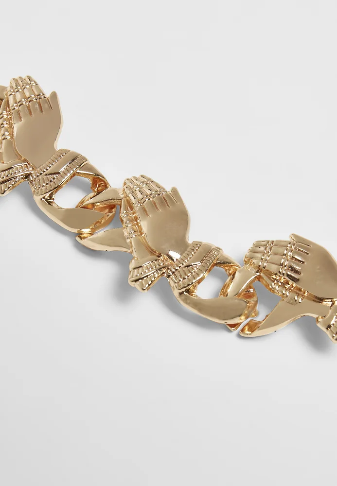 Ein echter Hingucker ist dieses Urban Classics Armband. Mit seinen großen Kettengliedern trägt es ordentlich auf, denn sie sind in Form betender Hände gefertigt. Das auffällige Armband besteht aus einer Metalllegierung es wird mit einem Steckverschluss geöffnet und geschlossen.
