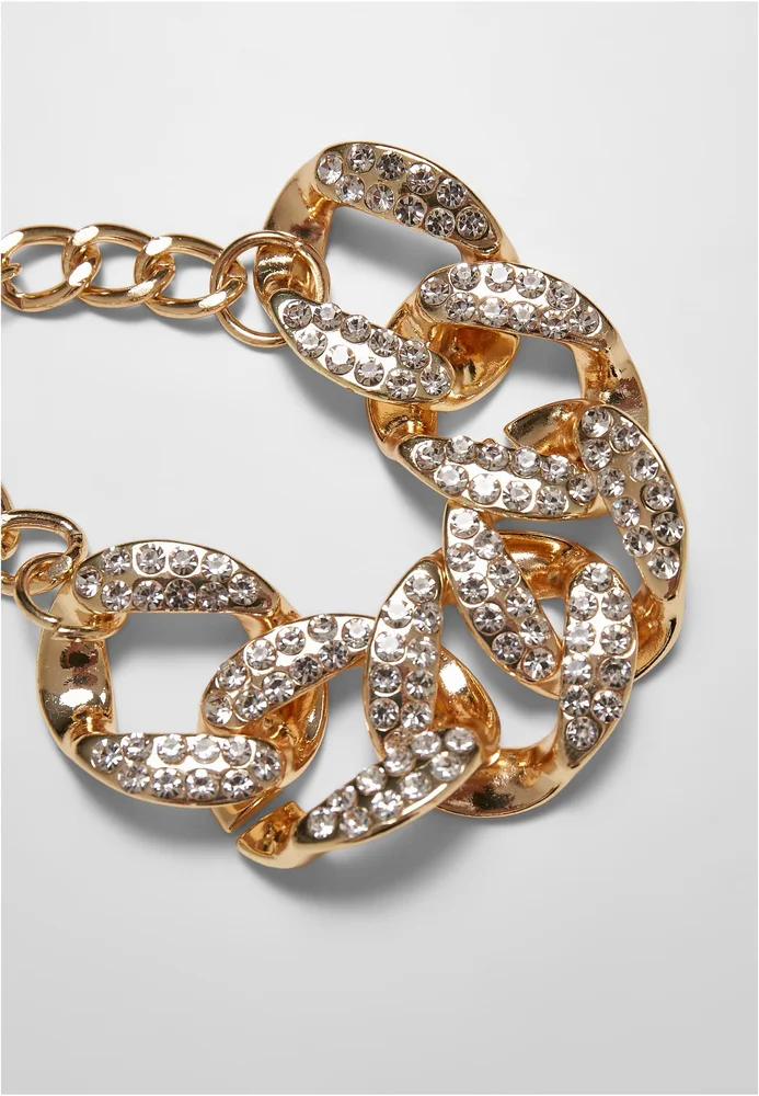 Das Modeschmuck Armband setzt voll auf sechs großen Panzerkettenglieder, die sich ineinander schmiegen und mit einer Doppelreihe Strass-Steinchen besetzt sind. Das Armband ist 21 Zentimeter lang und besteht aus einer Zinklegierung und Eisen.