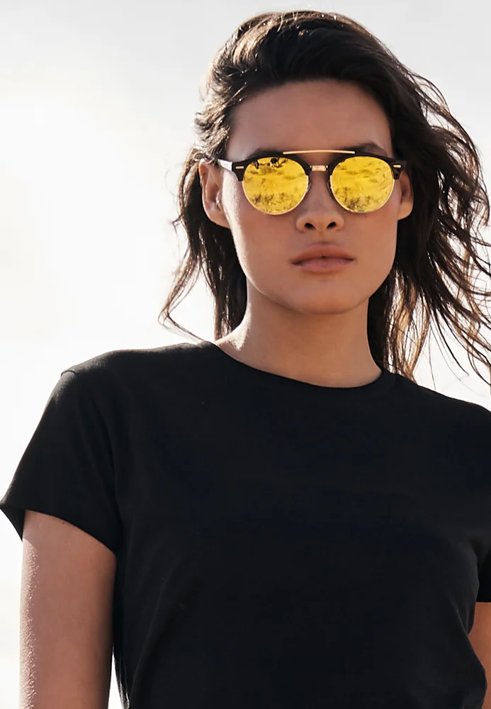 Schlicht kann jeder, aber wer auffallen will, setzt auf diesen gelungenen Mixed-Style. Rahmen und Steg wechseln sich gekonnt im Material und Dicke ab. Die Bügel sind schlank und elegant. Die runden Gläser in Yellowgold oder Blue, welche einen UV400 Sonnenschutzfaktor aufweisen, fügen sich perfekt in das besondere Design ein und färben deinen Alltag angenehm bunt ein.