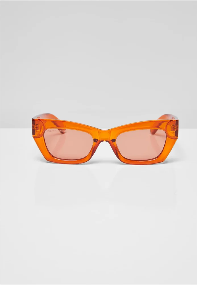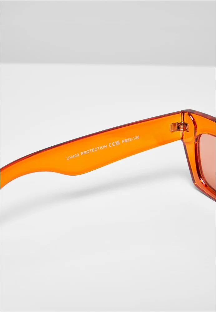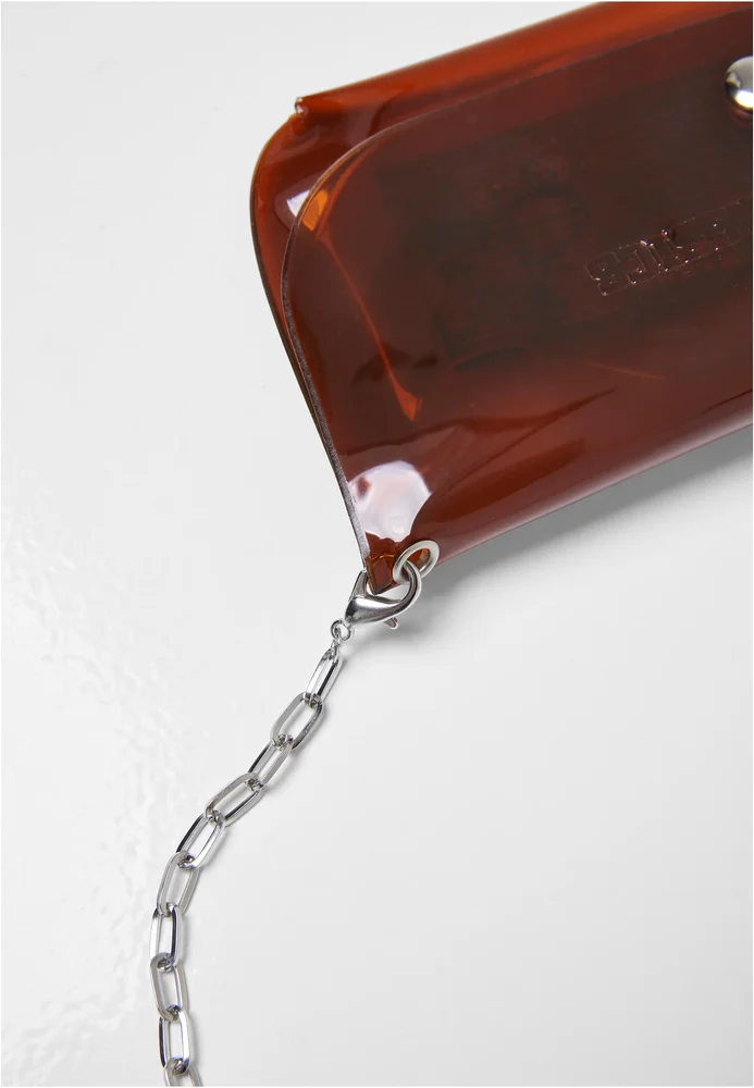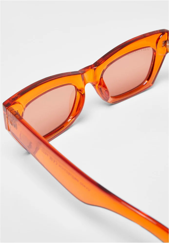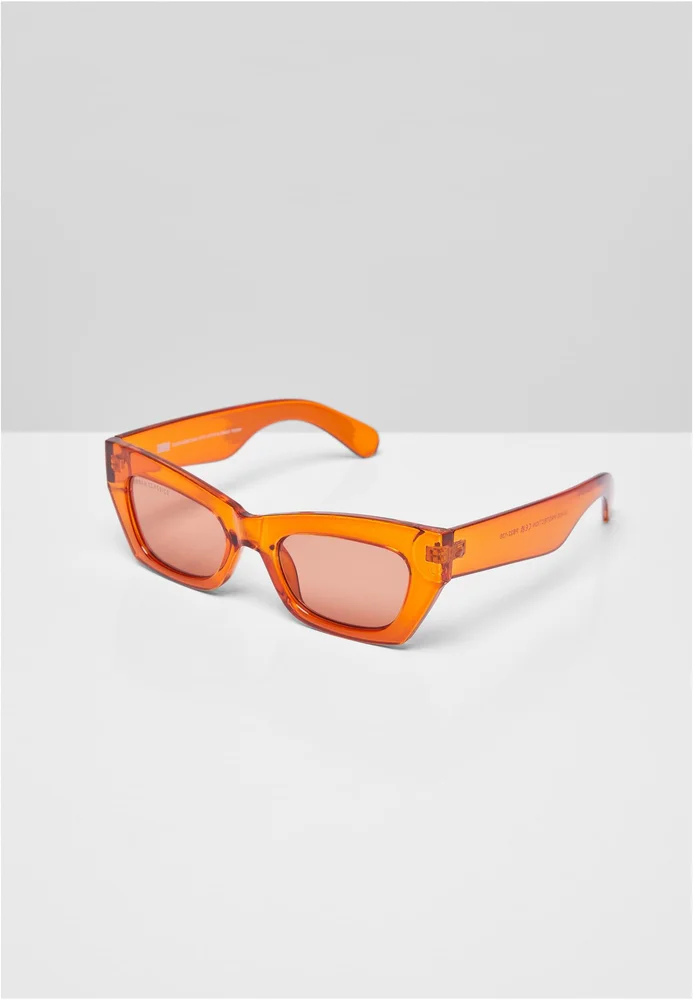 Die Sonnenbrille fällt mit ihrem breiten, transparenten Kunststoffgestell und den kleinen Gläsern auf, die an die feminine Cateye-Form angelehnt sind. Ihre Bügel sind breit und gerade und die Gläser mit UV 400 Schutz ausgestattet. Die Sonnenbrille kommt mit einer praktischen Schutzhülle samt Kordelzug und Urban Classics Schriftzug. Zum Accessoire-Set gehört außerdem ein modernes Brillenetui: Es besteht aus transparentem, glänzendem Polyester und wird mit einem Deckel und Druckknopf geschlossen. Gebrandet ist es mit einem Urban Classics Schriftzug. Das Etui wird von einer feinen Ankerkette komplettiert, die abgenommen werden kann. Das Material ist Polyester und Eisen.