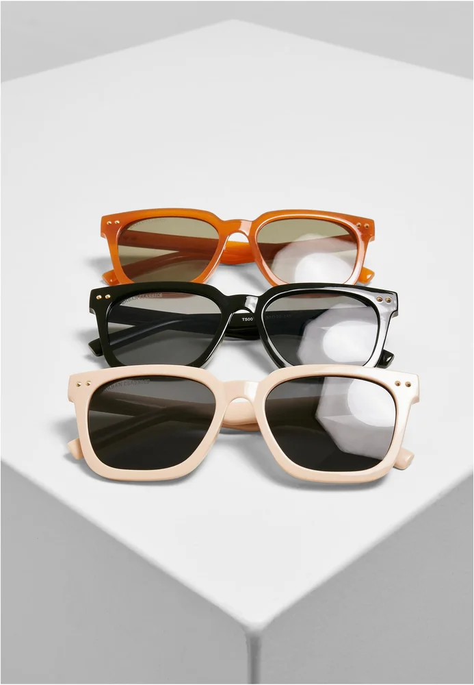 Das stylische Dreierset kombiniert drei unifarbene Kunststoff-Sonnenbrillen in einer stimmigen Farbvarianz. Rahmen und Bügel sind mittelbreit, Akzente setzen jeweils zwei Metallnieten am Ansatzpunkt der Bügel. Die Sonnenbrillen aus Polycarbonat sind selbstredend mit UV 400 Schutz ausgestattet.