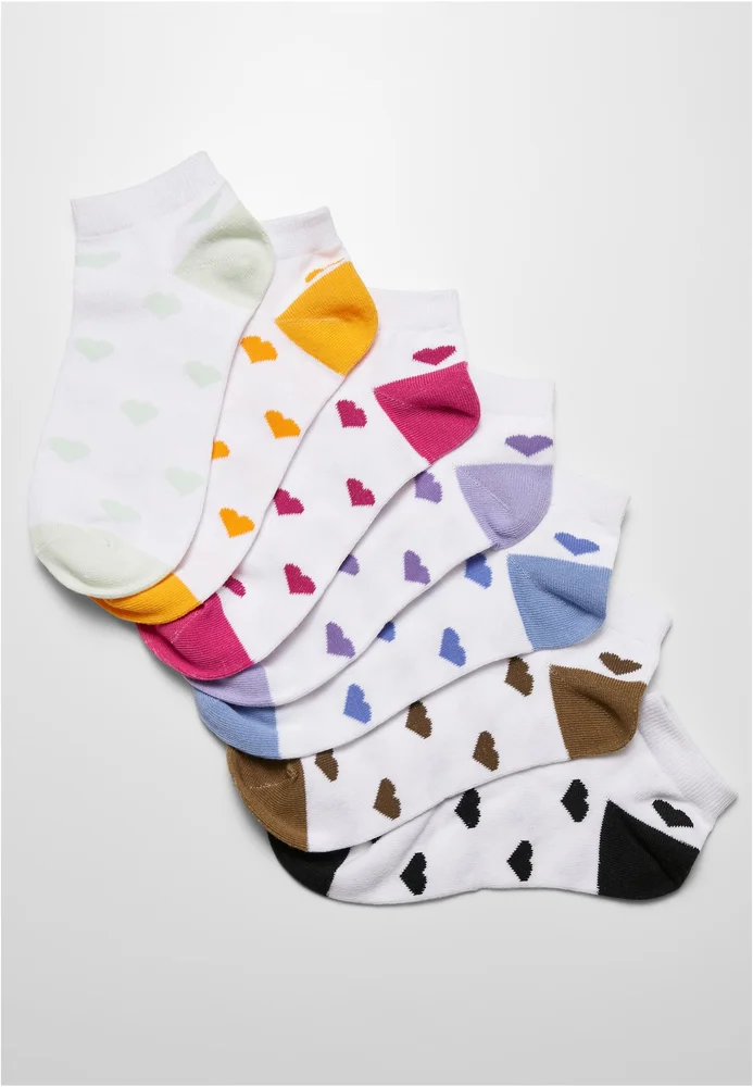 Sieben praktische Sneakers-Socken mit herzigem Design vereint dieses Set: alle Paare kommen zweifarbig mit eingewirkten Herzchen als Allover-Motiv. Zehen- und Fersenpartie sind zudem farblich passend abgehoben