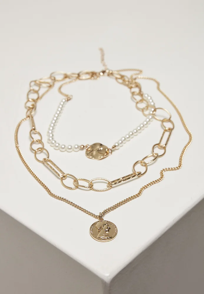 Mit fettem Style wertet diese dreireihige Schmuck-Kette jedes Urban Outfit auf. Die feine äußere Reihe trägt ein rundes Amulett mit einem Porträt im Profil. Die mittlere Reihe überzeugt mit ihren großen runden wie länglichen Gliedern. Die innere Reihe des Schmuckstücks besteht aus Perlen und einem Amulett in Wellenform. Das Urban Classics Accessoire besteht aus Eisen, einer Zink-Legierung sowie ABS.