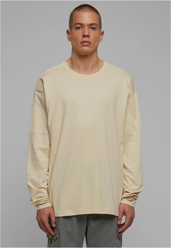 Das Herren Longsleeve folgt der Raglan-Form im Rücken und hat eingesetzte Ärmel an der vorderen Schulter. Die Besonderheit sind die rückseitigen Schulterpartien und Ärmel aus glattem Nylon, das einen interessanten Kontrast mit der ebenfalls verwendeten Baumwolle bildet. Einen weiteren Akzent setzen die Teilungsnähte der Ärmel. Lässig wird das Männer Longsleeve dank der Oversize Passform mit überschnittenen Schultern. Der Style wird von einem Rundhalsausschnitt abgerundet.