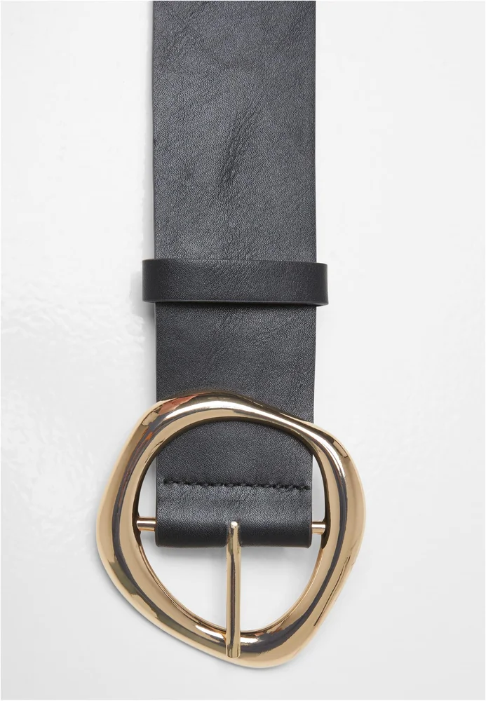 Gürtel für den Alltag, der als taillenbetontes Accessoire klare Linien mit einem auffälligen, organisch geformten Schnallen-Detail verbindet; das synthetische Leder vermittelt eine glatte Oberfläche mit dezenter Struktur und sorgt für eine definierte Silhouette. Die große, abgerundete Metallschnalle mit Dornverschluss und die angenähte Schlaufe bieten sichere Fixierung und einfache Handhabung, während das durchgehende Band einen klaren, ununterbrochenen Saum zeigt. Kombinierbar zu entspannten oder leicht formellen Looks, lässt sich der Gürtel unkompliziert anpassen und trägt durch seine feste Konstruktion angenehm und stabil über den Tag.