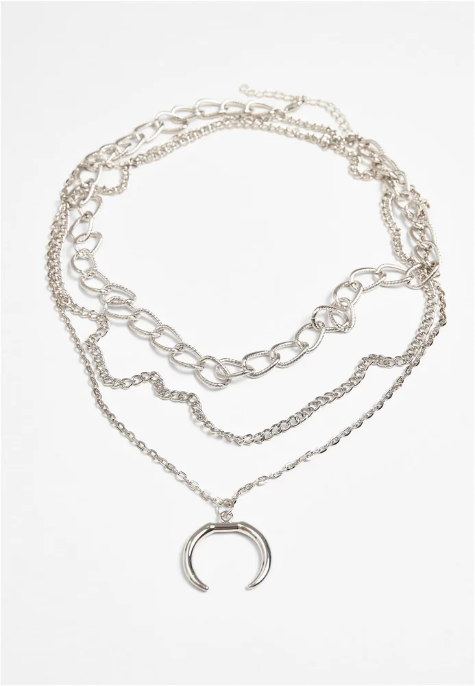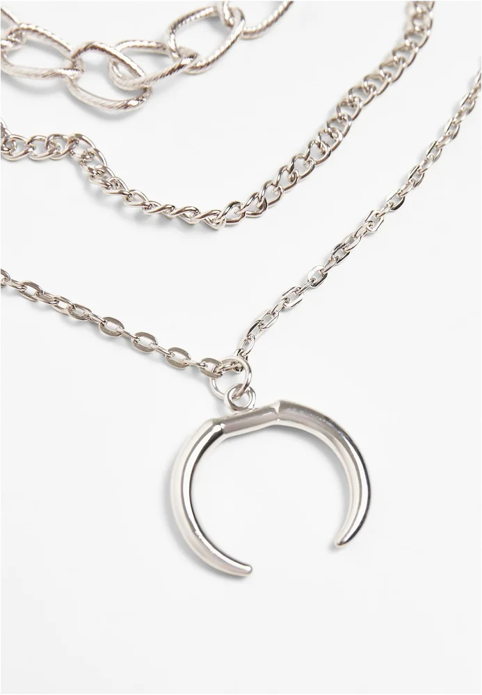 Der Modeschmuck punktet mit einem Layer-Style aus drei Reihen mit unterschiedlicher Gliederform und Größen, die an die Optik von Panzer- und Ankerketten angelehnt sind. Das Accessoire sitzt mittelhoch am Hals, die mittlere Kette ziert ein halbmondförmiger Anhänger. Die Halskette ist 48 cm lang und kommt mit einer 7 cm langen Verlängerungskette. Sie besteht aus Eisen und einer Zink-Legierung.