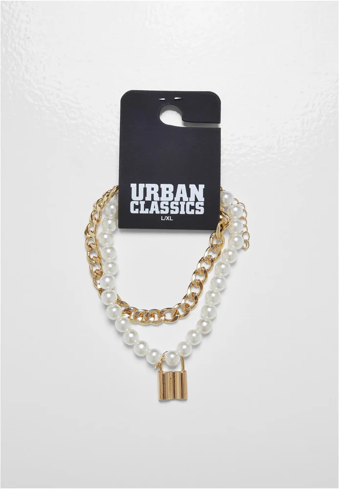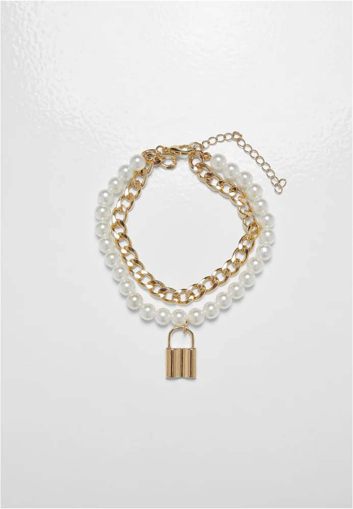Das zweireihige Armband macht als Accessoire ordentlich was her und besteht aus zwei miteinander verbundenen Ketten. Eine goldene Basic-Kette wird mit einer Perlenkette ergänzt, die als besonderes Gimmick noch ein goldenes Schloss mit sich trägt. Das Armband ist in zwei unterschiedlichen Größen verfügbar.