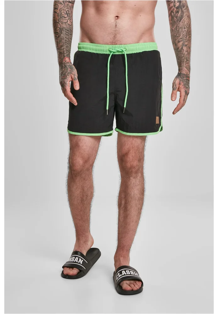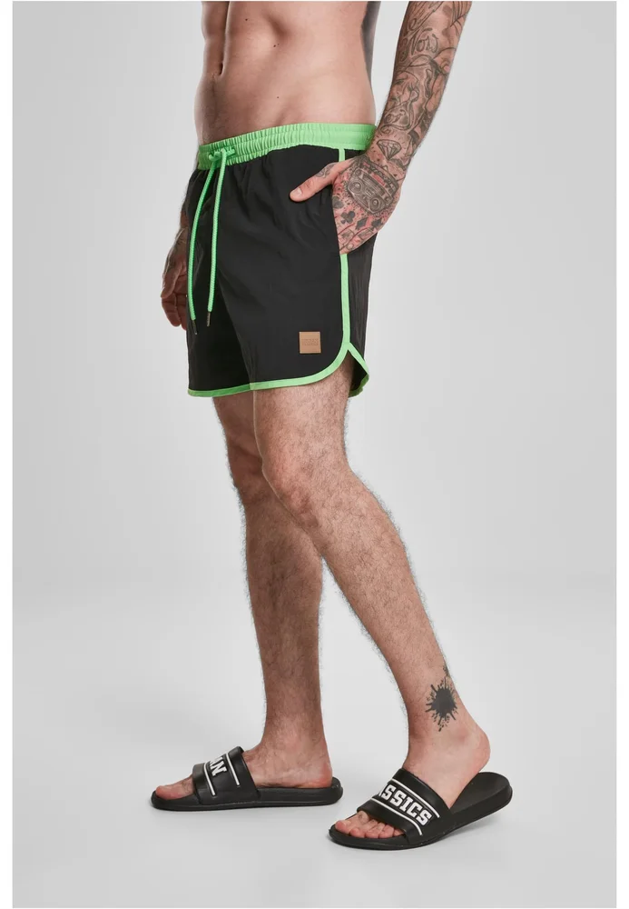 Ein Hauch von Vintage fürs Wasser: Die Retro Look Swim Shorts von Urban Classics kombinieren klassisches Design mit moderner Funktion. Nylon macht sie leicht, strapazierfähig und schnelltrocknend, während der elastische Bund mit Kordelzug für Flexibilität sorgt. Kontrastdetails geben der Badehose einen markanten Retro-Touch, der jedes Sommer-Outfit abrundet. Ideal für Pool, Strand und lässige Streetwear-Kombis.