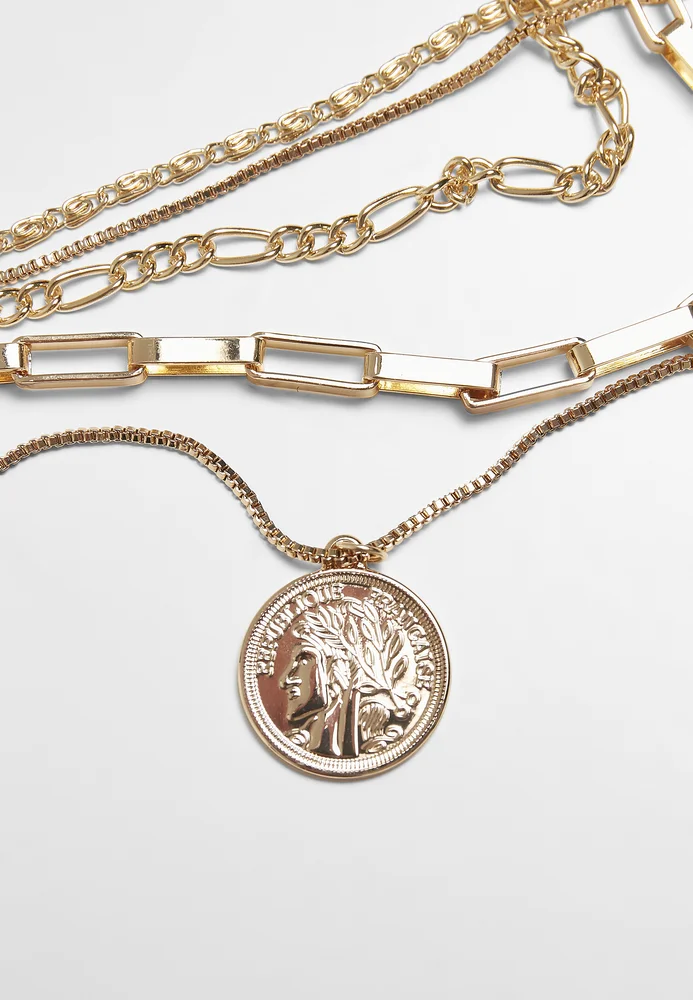 Die vierreihige Modeschmuck-Kette vereint ganze vier unterschiedliche Designs und mündet in einer filigranen äußeren Kette mit einem Amulett in Münzform. Die inneren Reihen besitzen eine Ankerketten- bzw. Figarokettenform. Das Urban Classics Schmuckstück besteht aus Eisen und einer Zinklegierung. Es kommt als Einheitsgröße.