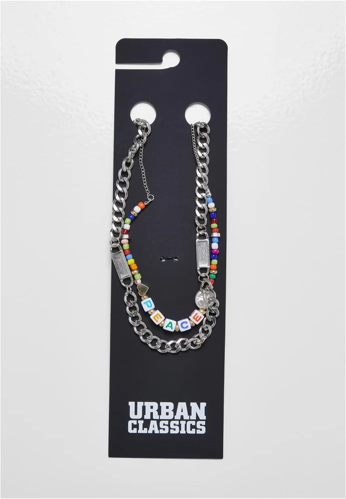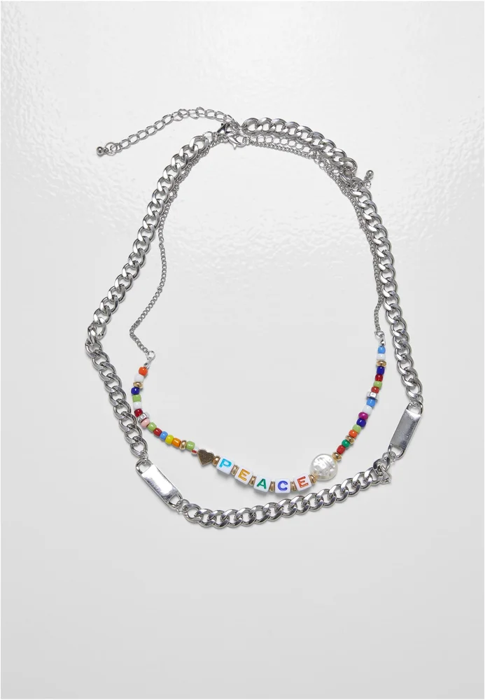 Das zweiteilige Modeschmuck-Set besteht aus zwei unterschiedlichen Ketten aus Eisen. Die größere Kette ist mit Bindeelementen ausgestattet und verwendet Panzerkettenglieder. Die kleinere Kette ist filigraner, dafür mit bunten Plastikperlen und einem fröhlichen Peace-Wording bestückt.