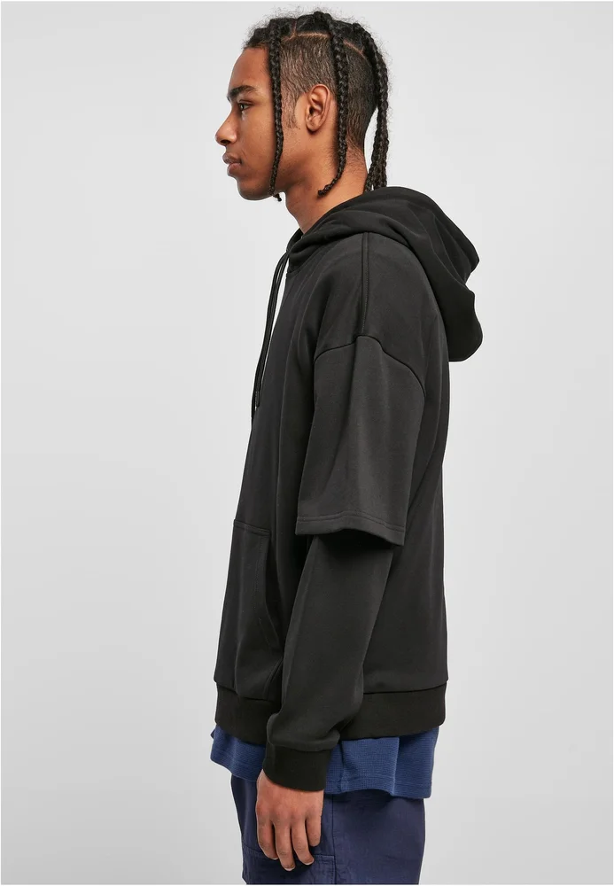 Der Männer Hoody zeigt sich als gelungene Variante des Standard-Modells mit langen Ärmeln, über die kurze genäht wurden. Dazu gibts eine Kapuze mit Kordelzug, eine Känguru-Tasche sowie breite Rippenbündchen an Ärmeln und Saum. Der Herren Hoody hat eine bequeme Oversize Fit Passform mit überschnittenen Schultern und besteht aus einem angenehmen weichen Sweat-Stoff.