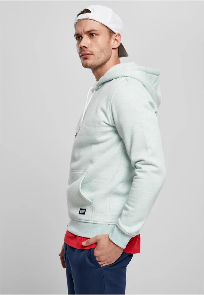 Das Herren Kapuzen-Sweatshirt hat alles, was ein Männer Hoodie braucht: eine gemütliche Kapuze mit Kordelzug, aufgewertete Metallenden, eine Känguru-Tasche mit einem kleinen Urban Classics Weblabel sowie Ripp-Ärmelbündchen und einen Ripp-Saum. Design Highlight des Herren Hoodys ist die edle Melange-Optik. Dazu punktet er mit 1A-Tragekomfort, dank regulärer Passform und weichem Brushed Fleece Stoff.