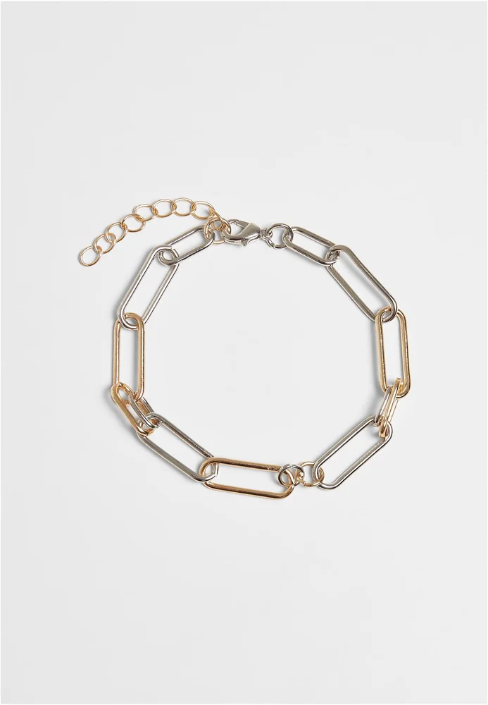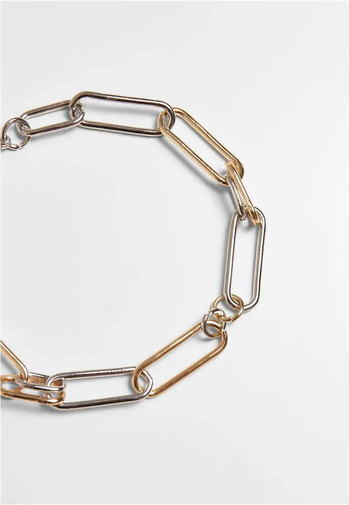 Das zweifarbige Armband fasziniert über die unterschiedliche Form seiner Kettenglieder. Diese sind jeweils rund, länglich, groß und klein. Das Armband besteht aus Eisen und ist 18 Zentimeter lang. Eine 7 Zentimeter lange Extension-Kette erlaubt eine individuelle Größeneinstellung.